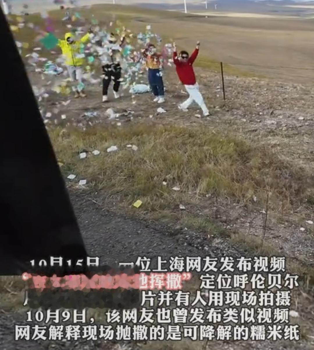 在内蒙呼伦贝尔大草原上有多名男女抛撒纸片拍照,一行人狂欢过后留下一地垃圾无人清理!视频曝光后引发网友强烈不满!