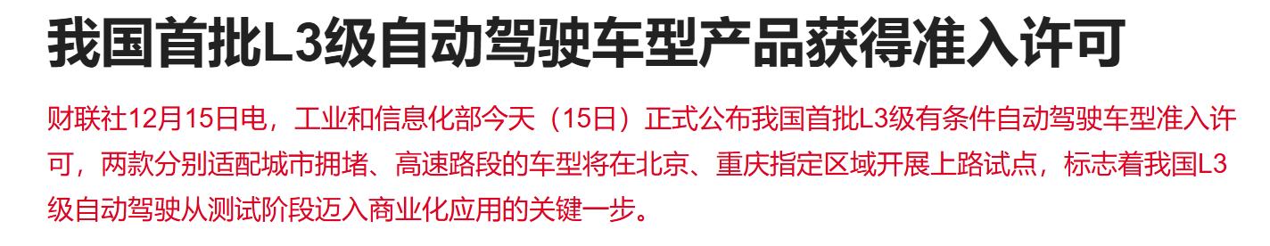 首批L3级有条件自动驾驶车型获得准入许可,这意味着咱们得L3级自动驾驶,正在从测试阶段,向商业化进程加速。