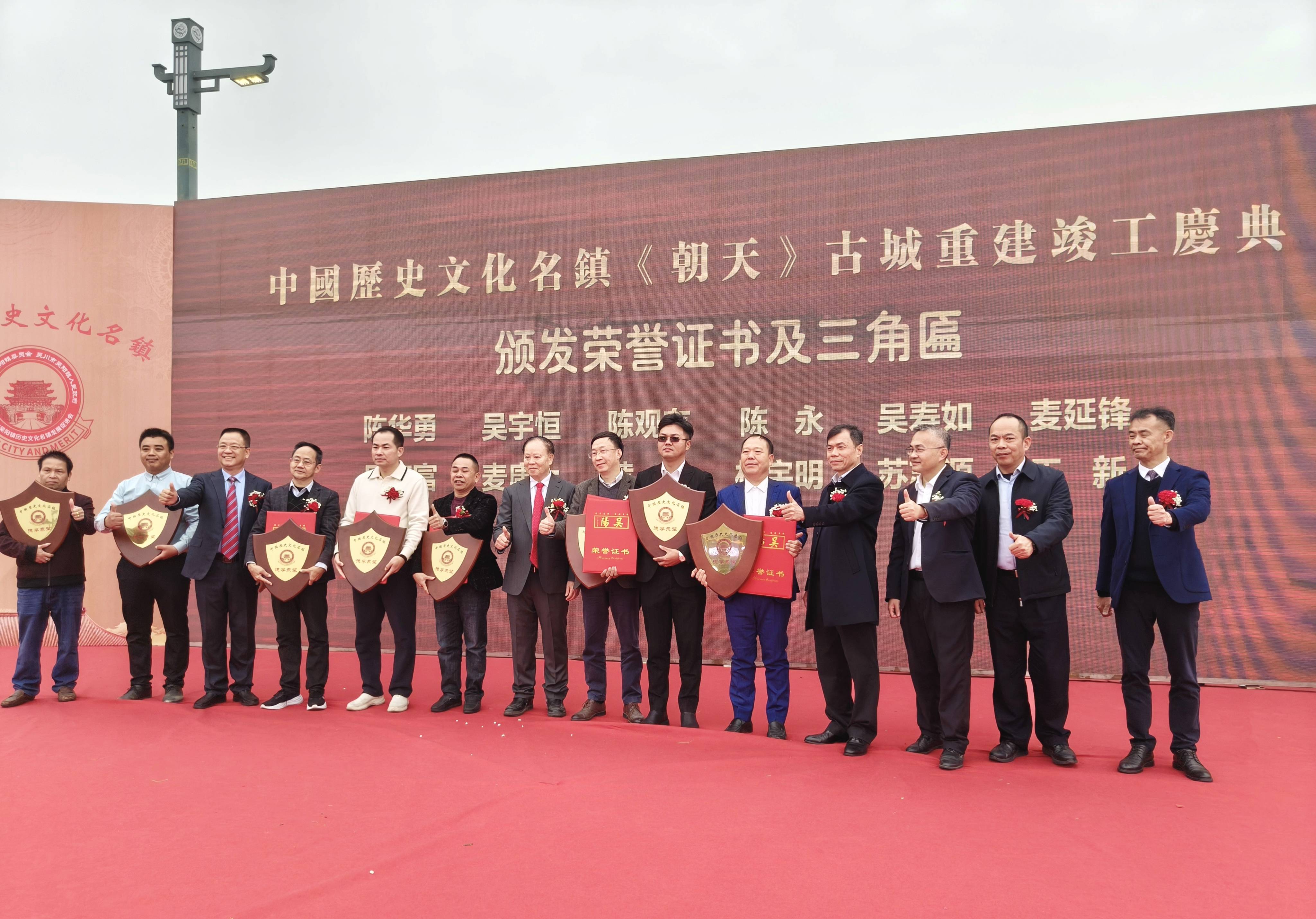 吴川市人大常委会党组书记、主任陈勇,吴川市副市长许粤涛,吴川市副市长、市公安局局长黄理,吴阳镇党委书记钟飘祥,深圳市宇马房地产开发有限公司董事长、吴阳镇历史文化名镇发展促进会会长林瑞涛,深圳市理想时代集团有限公司董事长、吴阳镇历史文化名镇发展促进会执行会长吴日松,广东永晟建设集团有限公司董事长、吴川市吴阳镇历史文化名镇发展促进会常务副会长文华盛,施工与设计代表、浙江大学博士黄俊等领导嘉宾出席竣工仪式,并共同为古城楼“朝天门”剪彩。