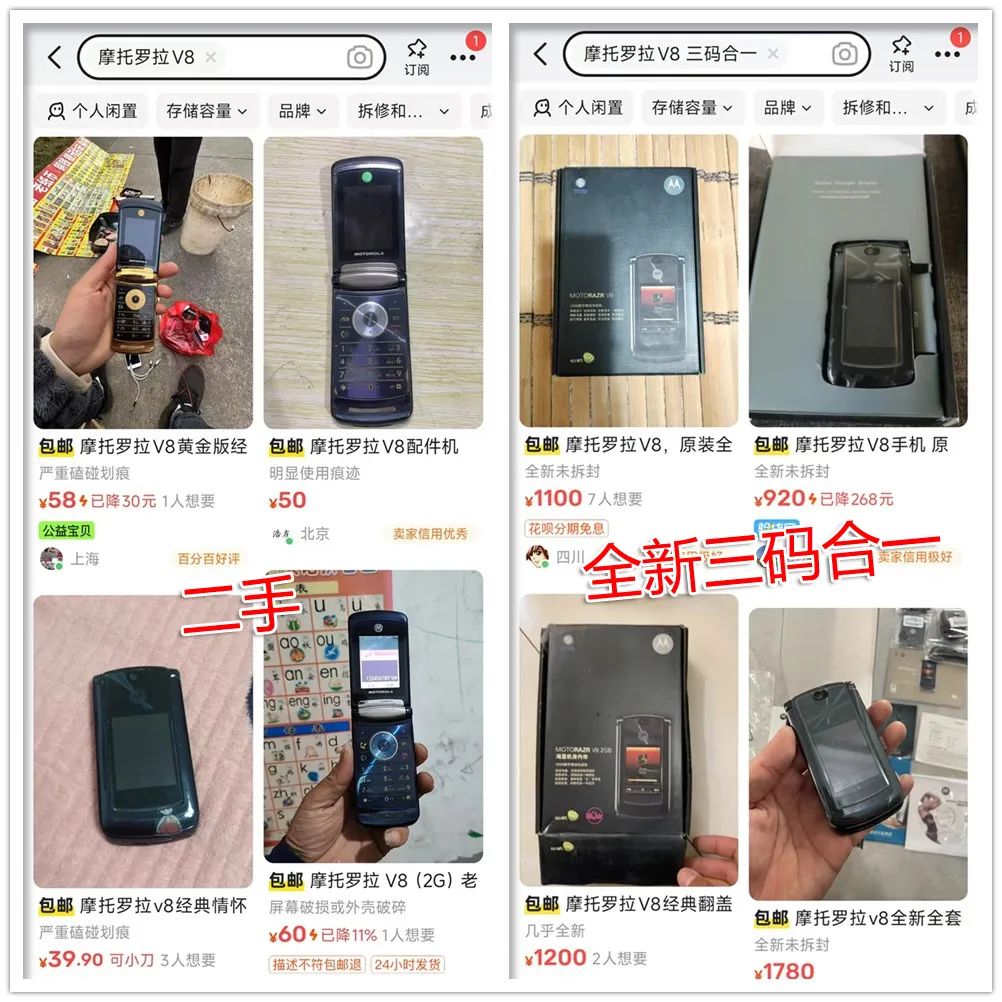 后来我又去小黄鱼瞅了一眼,二手摩托罗拉V8很便宜,通常40-60元就能搞定。但全新三码合一的价格直接破千,卖的人还不少,看来收藏这玩意的人挺多啊?