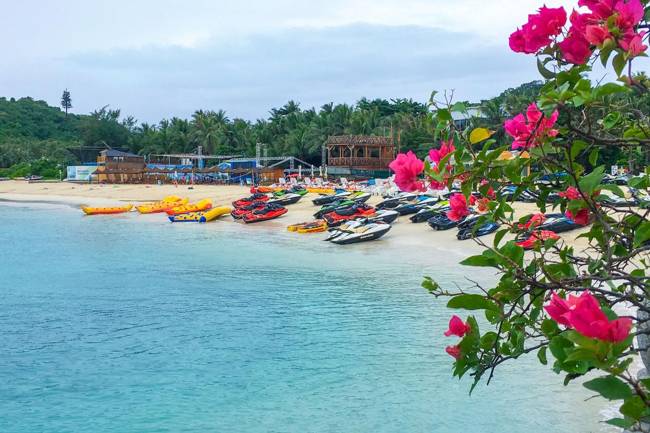 在三亚蜈支洲岛,自然景观让人心旷神怡,空气清新,阳光明媚,大量游人在沙滩各处景点拍照,海滩旁、椰林中、情人桥处、淡水泳池旁大量游人在拍摄个人、情侣、闺蜜、全家福写真。