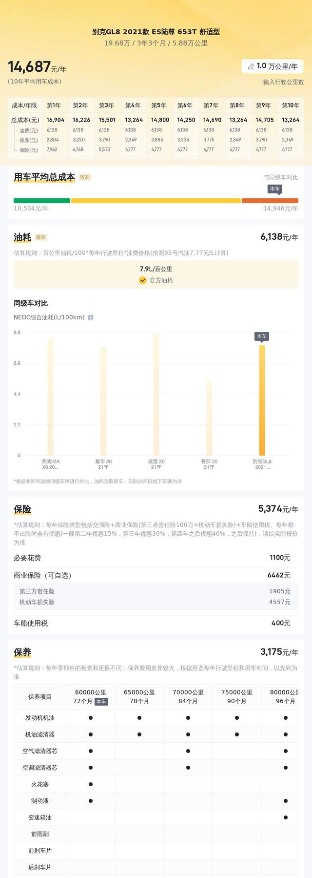 通过进一步计算,我们可以了解到这款车的年度用车成本。假设每年行驶一万公里,综合考虑燃油、保险以及保养等因素,这款车的年度使用成本约为14646元。这一数值在同类MPV中并不算高,很多家庭消费者在选择车型时,其实也将使用成本作为重要的衡量标准。因此,别克GL8在这方面的优势也为其赢得了更多潜在客户。