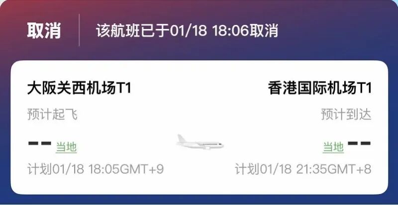 1月18日,国泰航空从日本大阪飞往香港的CX507航班在起飞前半小时突然取消,导致大量乘客滞留关西机场。航司回应称取消原因为技术故障,已为乘客安排后续航班并提供住宿补偿。