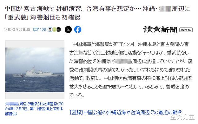 日本销量最高、影响力最大的报纸《读卖新闻》1月1日开年就爆了一个超级猛料——中国近日在宫古海峡进行封锁演习,在钓鱼岛周边还首次确认出现“重火力”的中国海警船编队。