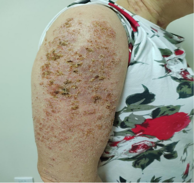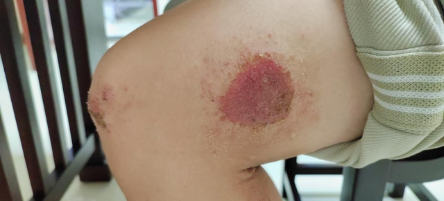 湿热浸淫型(急性期):起病急骤,多表现为红斑基础上密集的粟粒大小丘疹、丘疱疹和水疱,常有点状或小片状糜烂面,渗液明显,瘙痒剧烈。常伴有心烦口渴、大便秘结、小便短赤等症状。真实图片,请谨慎查看