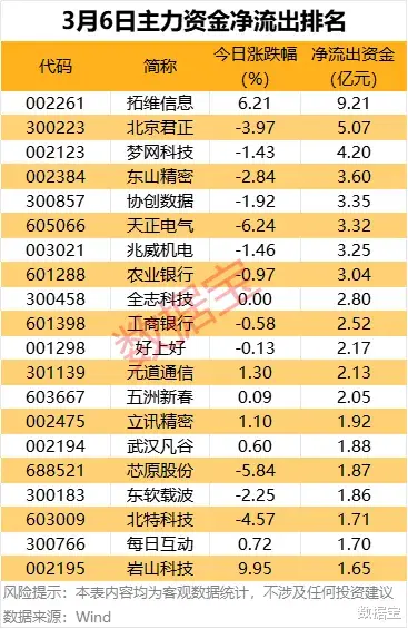 今日有13股主力资金净流出超2亿元。其中拓维信息、北京君正主力资金大幅净流出,净流出金额分别为9.21亿元、5.07亿元;梦网科技、东山精密、协创数据、天正电气主力资金净流出金额也居前。