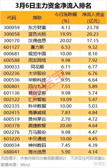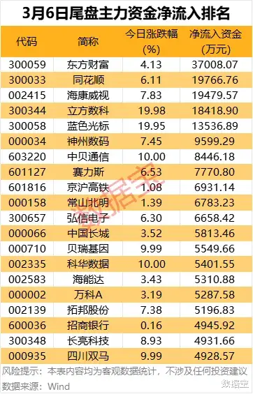 个股方面,东方财富尾盘获主力资金抢筹超3亿元;同花顺、海康威视、立方数科、蓝色光标均获主力资金抢筹超1亿元。