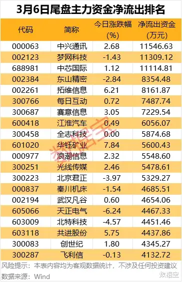 中兴通讯、梦网科技、中芯国际尾盘主力资金净流出超1亿元。东山精密、拓维信息、每日互动尾盘主力资金净流出居前。