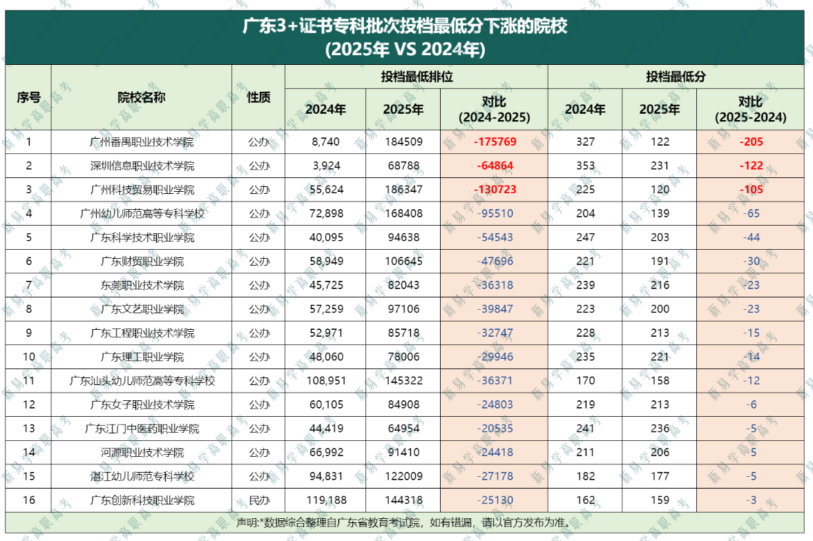 2025年3+证书跌幅最高的10所院校2025年广东3+证书高职高考录取跌幅最高的10所院校分别为:广州番禺职业技术学院、深圳信息职业技术学院、广州科技贸易职业学院、广州幼儿师范高等专科学校、广东科学技术职业学院、广东财贸职业学院、东莞职业技术学院、广东文艺职业学院、广东工程职业技术学院、广东理工职业学院。