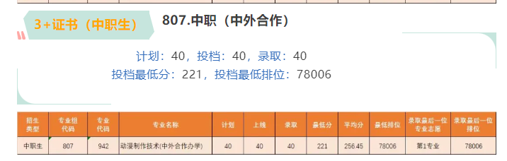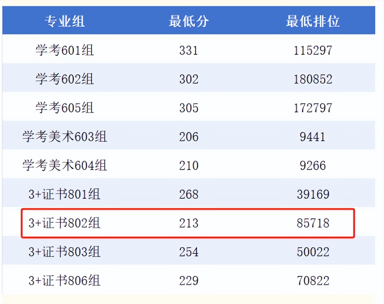 2025年3+证书最低录取分数213分!是802专业组,同比去年最低分降低了3.9万排名,23分!