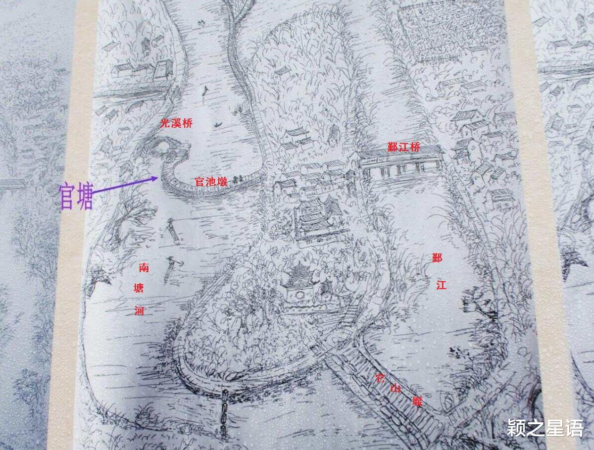 角尺形的官池墩,长边连接南岸,北端折东之后,与光溪桥相连,因此形成了既可以控制南塘河水量的水利工程,又成了可供行人往来两岸的交通工程。