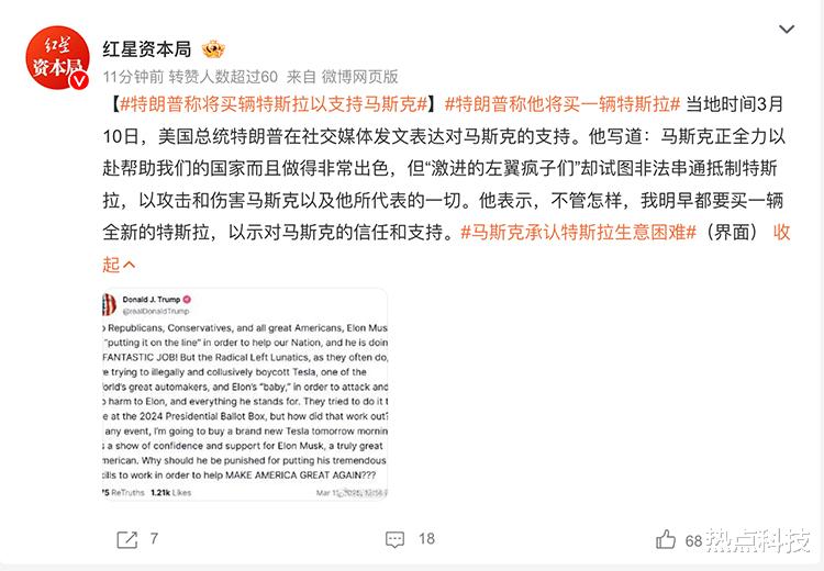 因为支持特朗普削减政府开支和裁员,马斯克最近麻烦不断,又是特斯拉被大规模抵制、又是和其他政府部门领导吵架,现在X平台也被攻击,老马真的是压力山大。为了安抚老马,特朗普今天公开表示要买一辆特斯拉支持一下老马生意。马斯克表示自己在政府效率部将会再干一年,而且他曾经叠过甲,说自己不会自杀,且看老马能不能扛得住这么大的精神压力和对手攻击吧。
