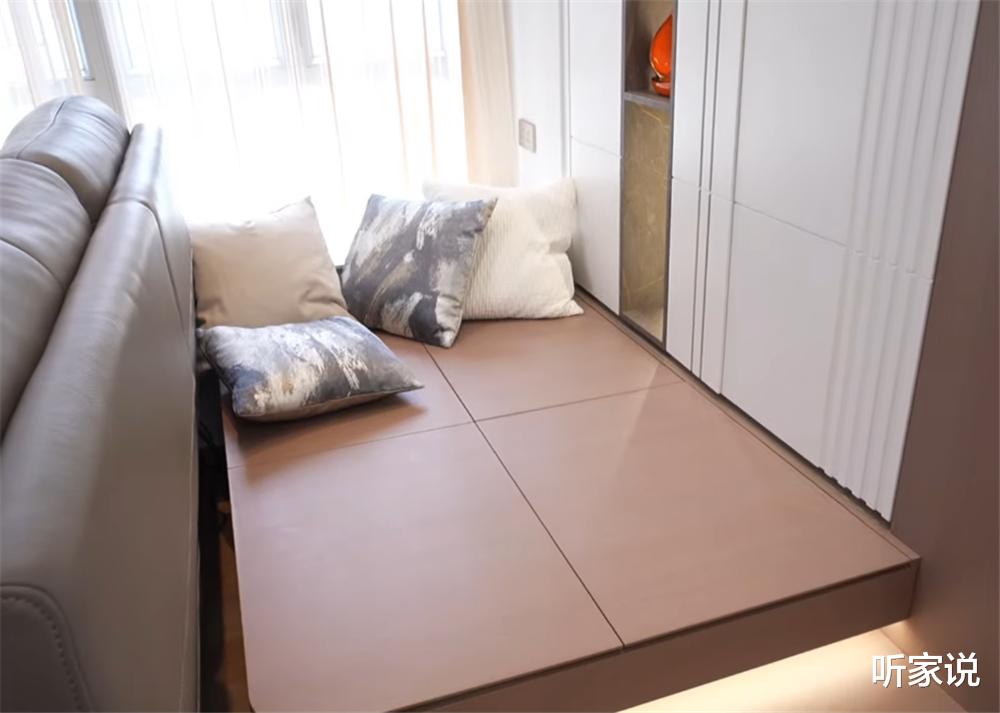 虽说一家五口不能同时坐在上面,但却也算有了一个完整的客厅功能,搭配沙发后面的地台,或者搬上两把餐椅来,一家人照样能围坐在客厅里聊聊天,谈谈心,很是惬意。