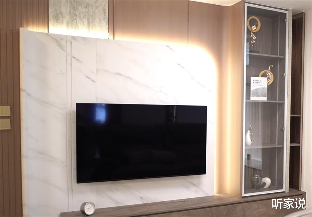 家里的客厅紧挨着玄关,电视墙几乎紧贴着房门,中间留出安装照明开关的位置。