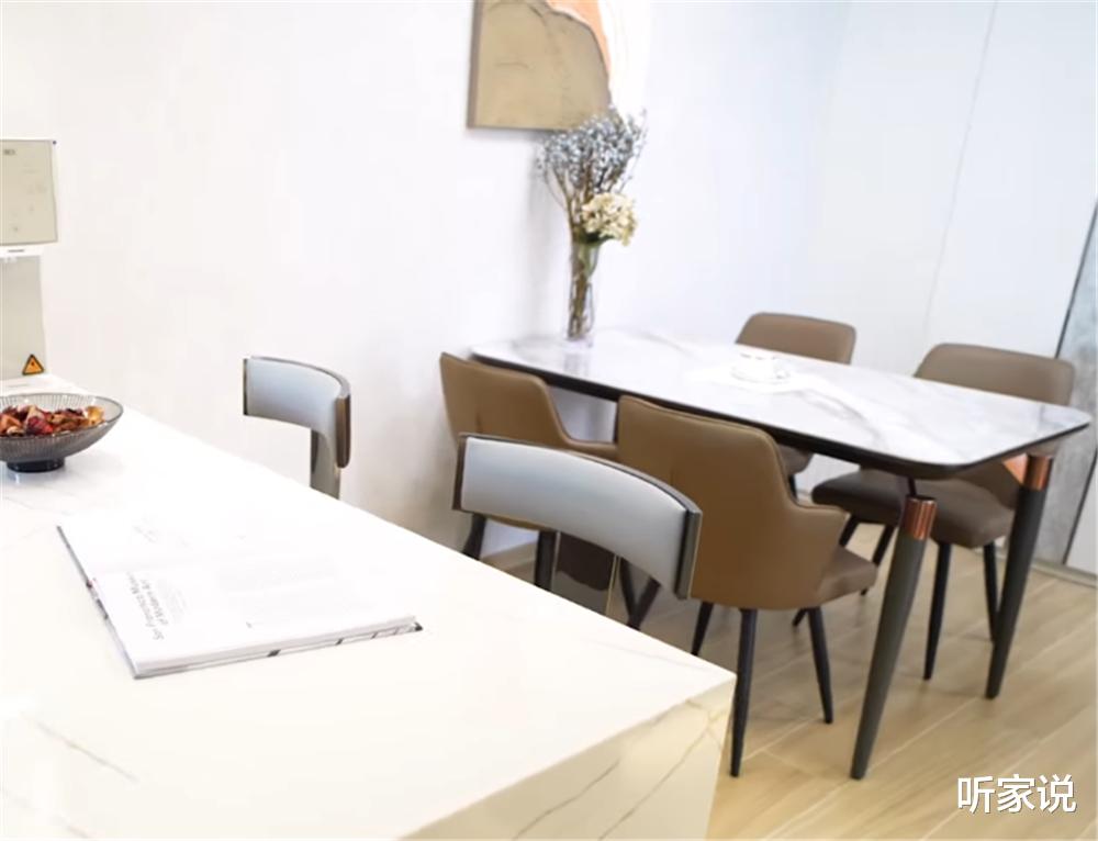 四人位的餐桌,再加上用岛台另一边做成的吧台餐桌,坐下五口人倒也富裕,虽说没有装餐边柜的位置,但距离开放式厨房较近,倒也足够放下一些杯盏餐具,代替餐边柜的功能。