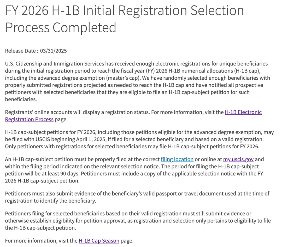 刚刚美国移民局发布2025年H-1B抽签最新进展:移民局已经收到足量的H-1B注册,移民局已经抽取了足够的能够满足H-1B年度配额的有效注册;移民局已经在H-1B注册系统中更新了所有H-1B中签信息!