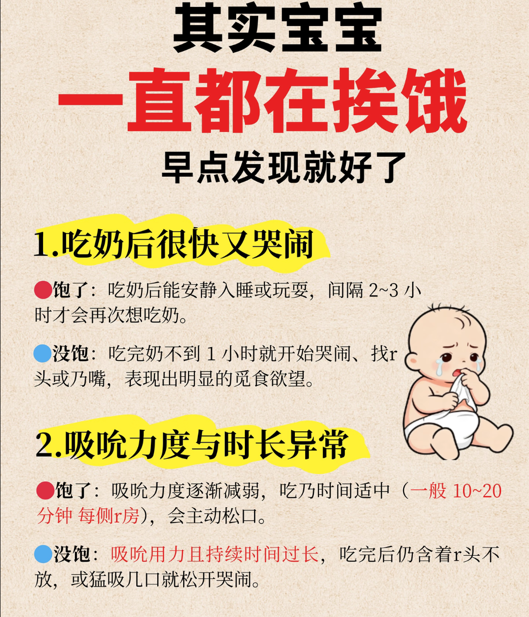 其实,宝宝从来不会无缘无故地闹脾气,他们只是还没学会说话,只能用自己特有的方式告诉你:“妈妈,我饿了!”可惜这些信号太容易被我们忽略了。等到大哭大闹时,已经是最后的“抗议”,就像我们饿到胃疼时的焦躁不安。