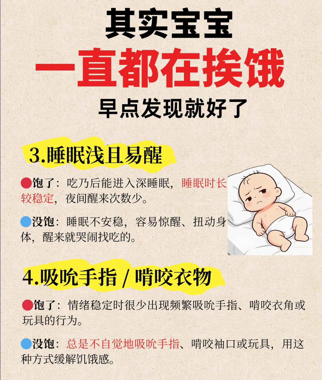 还有那些爱啃东西的小动作也要留心。不管是自己的衣领、被角,还是你的手指,只要逮着就往嘴里塞,拼命地吮吸,这多半是饿了。别总说“这孩子怎么什么都吃”,也许他只是想告诉你:“我饿得什么都想尝一尝了。”