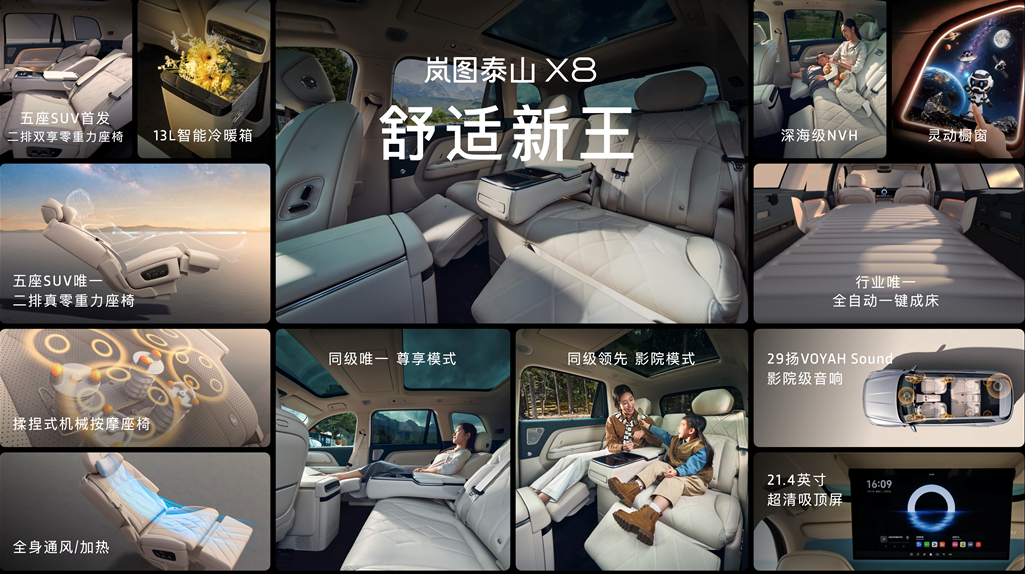 岚图泰山X8拥有6.1平方米的中国五座SUV最大座舱面积,搭配同级唯一的二排双享零重力座椅,可让身体真正“躺平”,是五座SUV中罕见的“头等舱”体验;行业首发的揉捏式机械按摩座椅,实现全身32点按摩,从肩颈到腰背层层放松。岚图泰山X8还配备了行业唯一的全自动一键成床功能,只需动动手指,一分钟就能铺好一张2.1米移动舒享大床,秒变“移动的总统套房”。其后备厢更是暗藏玄机,基础容积1148L,可轻松容纳11个20寸行李箱,二排放倒后可拓展至2361L,还能秒变“车载衣帽间”,堪称空间魔法师。