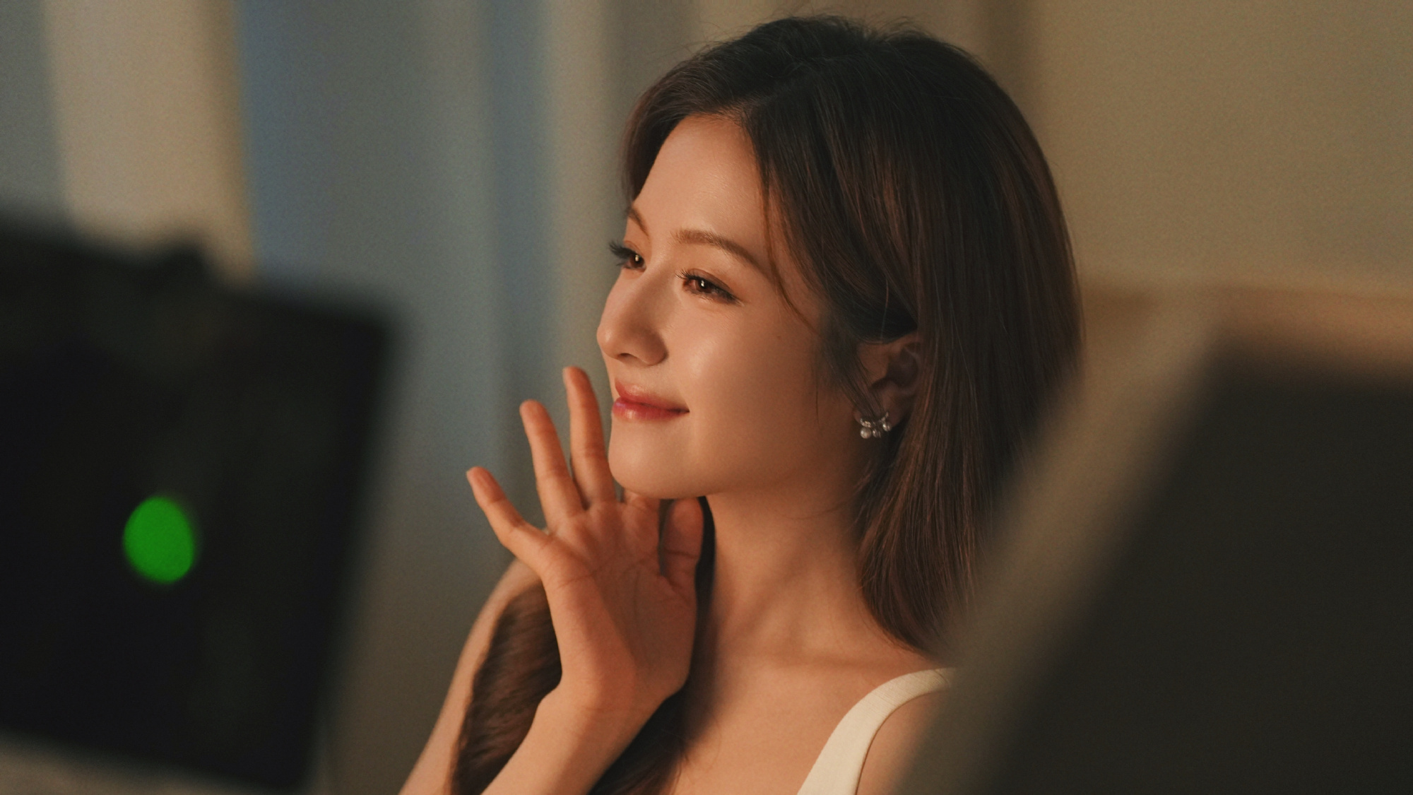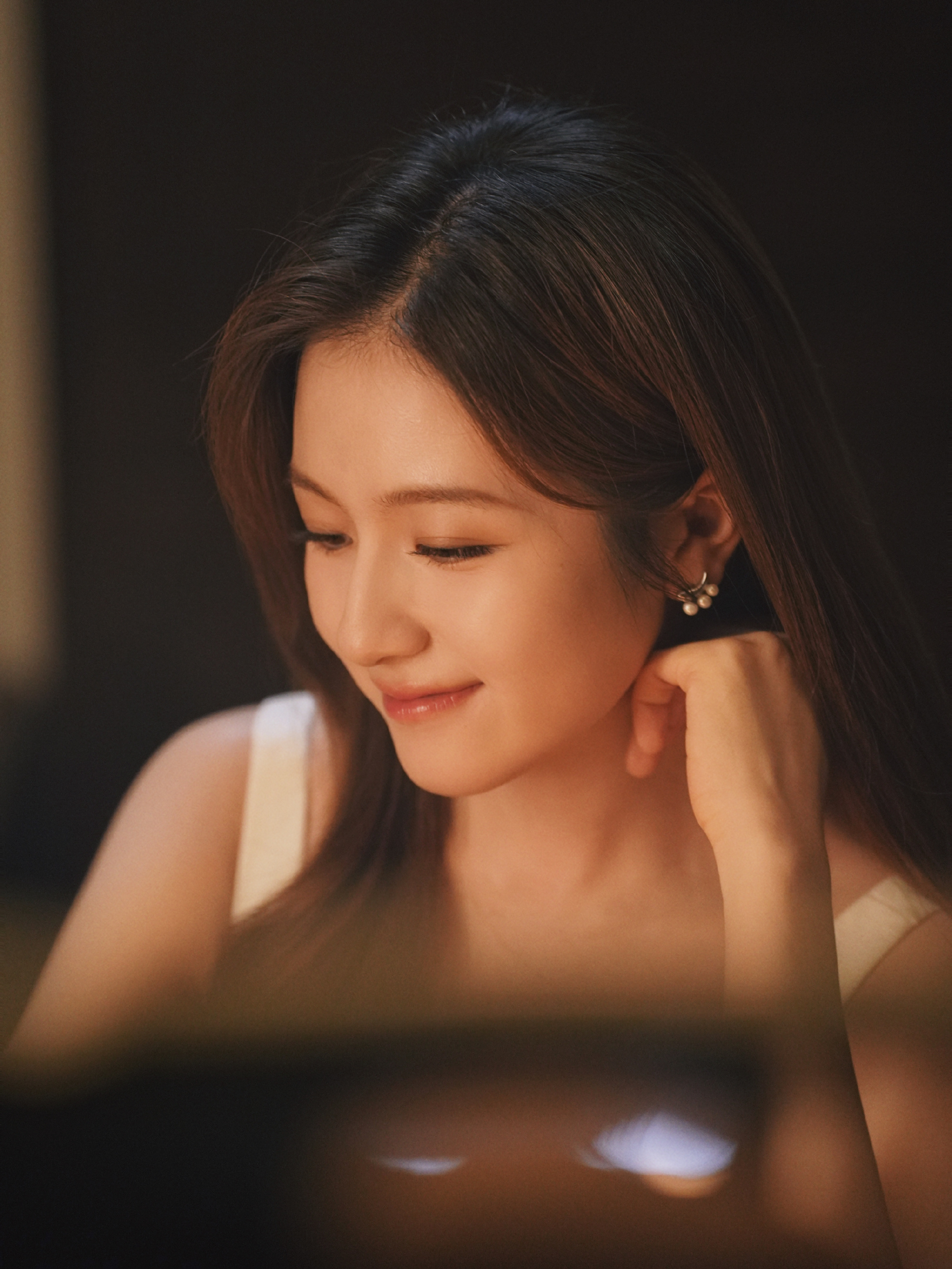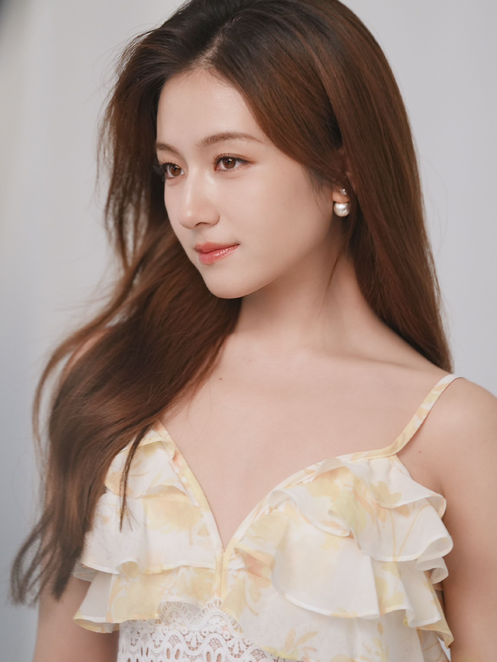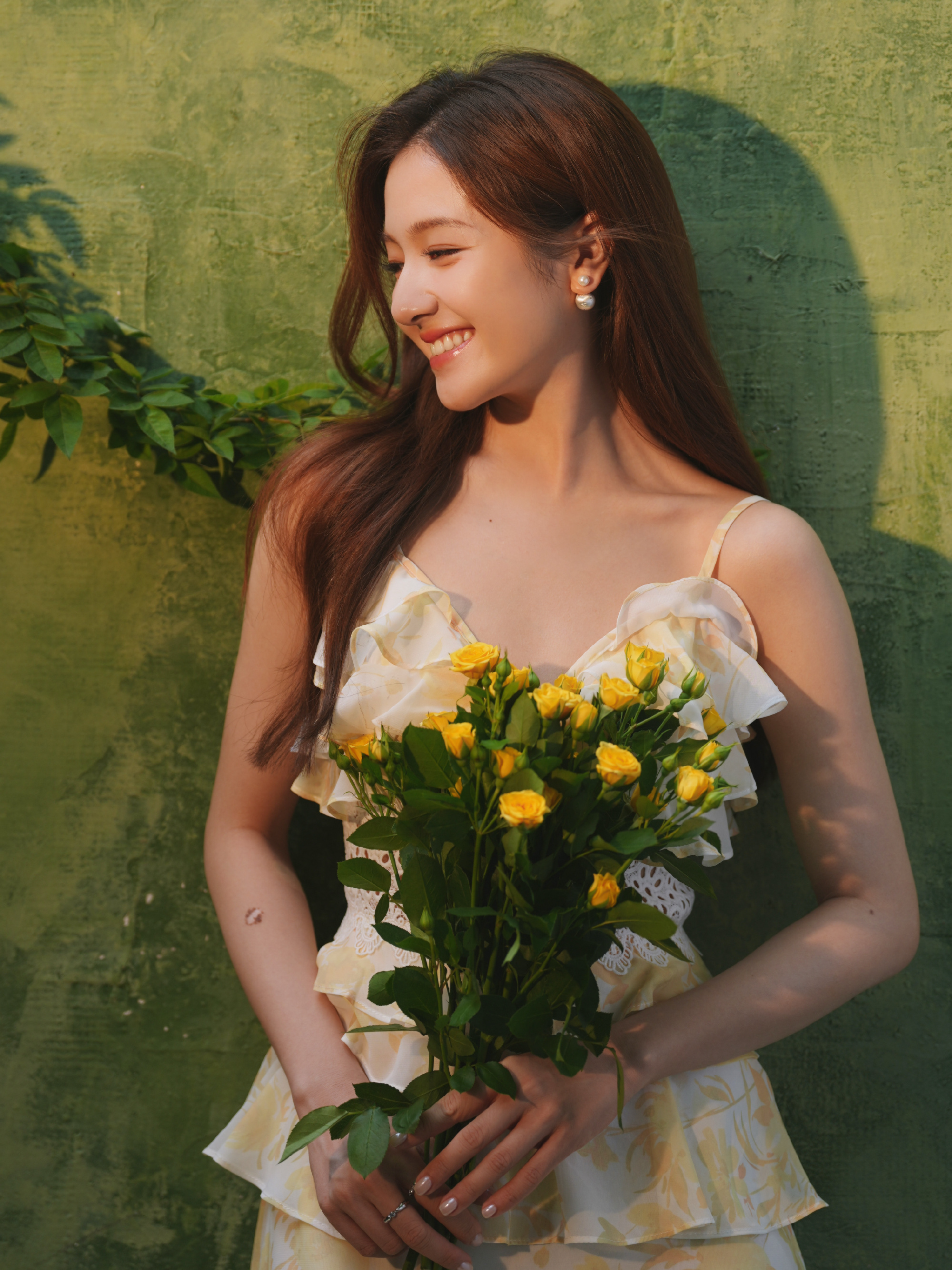 搭配方面更是恰到好处,脚上一双白色一字带凉鞋,手上拎着小巧的银色链条包,没有多余的配饰堆砌,反而让整体造型更显干净利落。妆容上她选择了淡妆出镜,柳叶眉搭配自然眼妆,唇色是温柔的豆沙色,长发随意地披在肩头,几缕碎发修饰脸型,整个人透着一股邻家女孩般的亲和力。