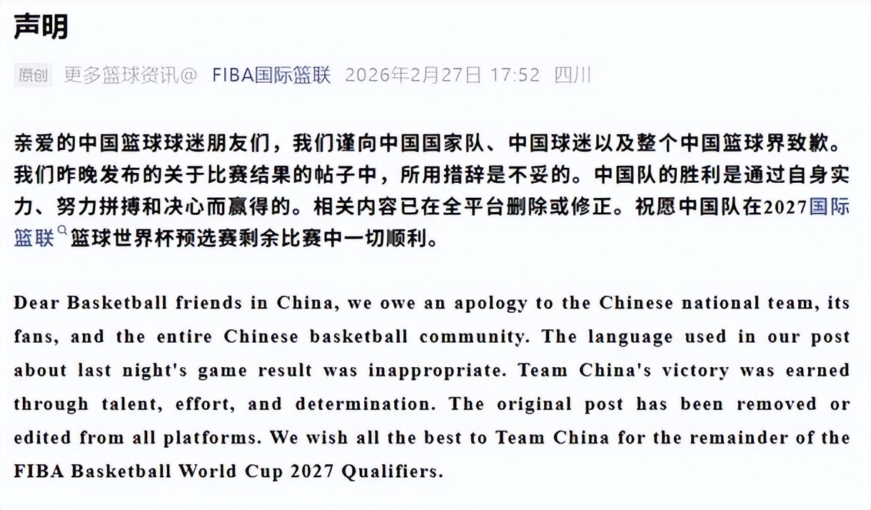 2月27日,一则关于中国男篮的好消息传来:国际篮联(FIBA)官方正式向中国国家队、中国球迷以及整个中国篮球界致歉,此前因不当言论引发的争议,终于有了一个合理的交代,无数中国球迷纷纷表示:太解气了,正义虽迟但到!