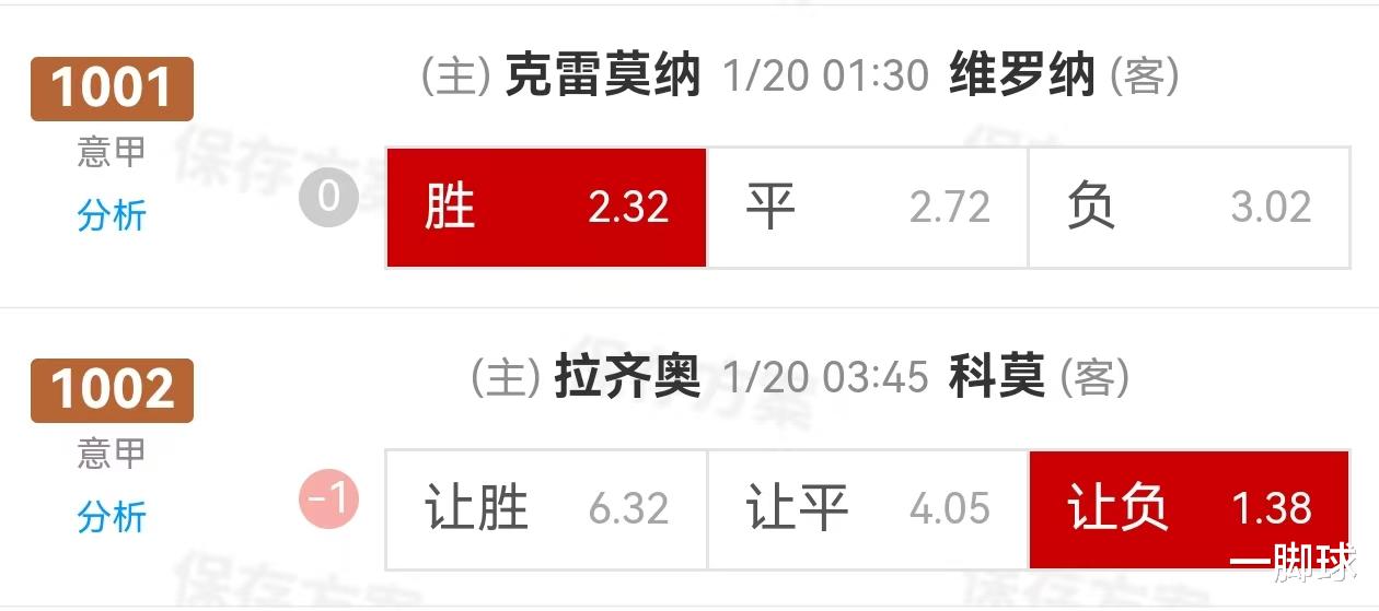 {一脚球}竞彩推荐:克雷莫纳VS维罗纳+拉齐奥VS科莫