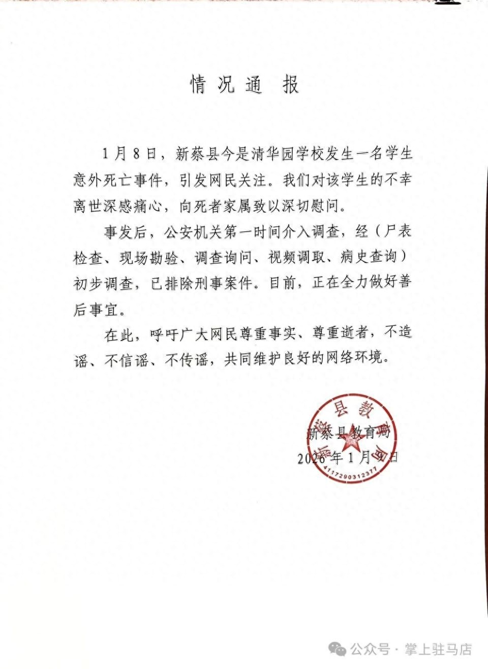 1月9日,“掌上驻马店”微信公众号发布情况通报: 1月8日,新蔡县今是清华园学校发生一名学生意外死亡事件,引发网民关注。