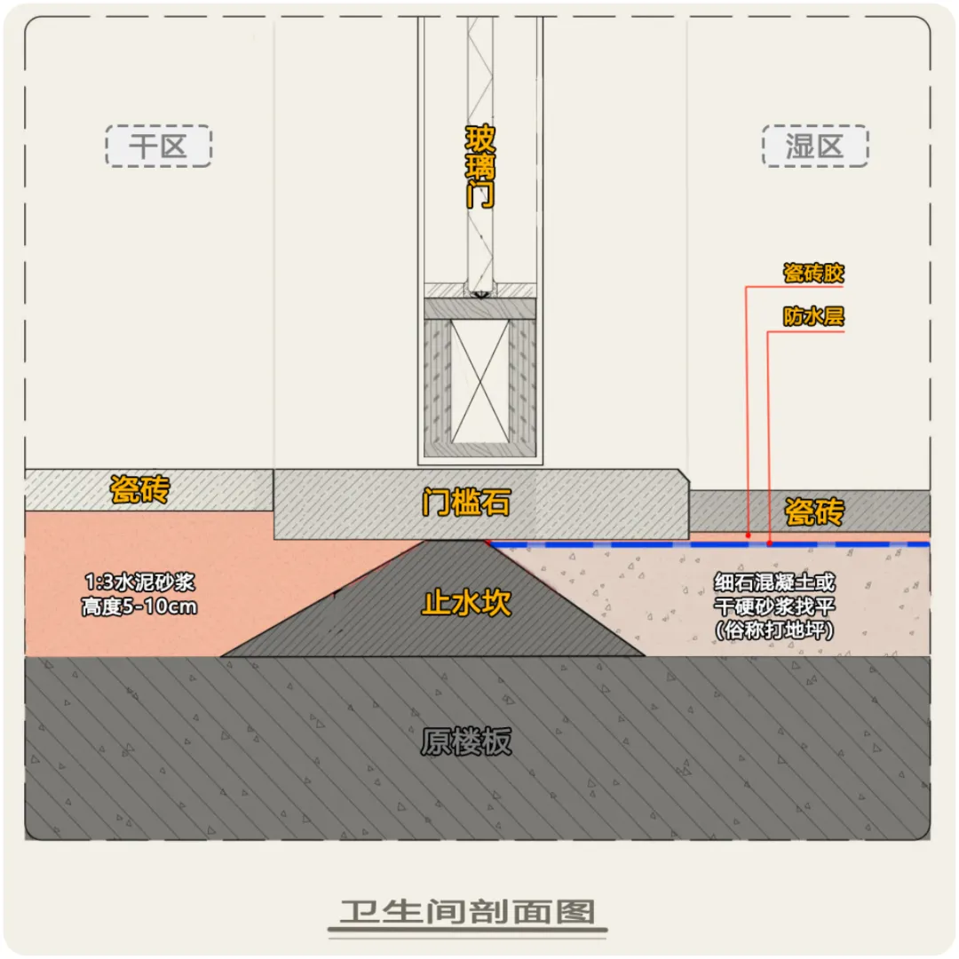 ▲如上图所示,过门石相较于瓷砖,可以做的厚且强度高踩不坏,所以仅存的作用,阻拦卫生间的地面潮气扩散到卫生间以外的空间。