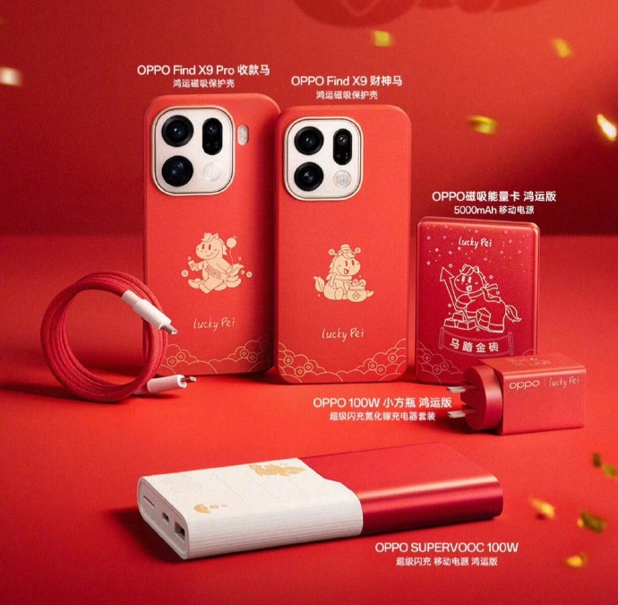 OPPO限定鸿运手机壳、充电器套装、充电宝配件,鸿运当头的寓意够红。套上Find X9收款马手机壳和Find X9 Pro财神马手机壳,来年钱钱都跑到手机里,配件上小马图案设计得也很可爱。