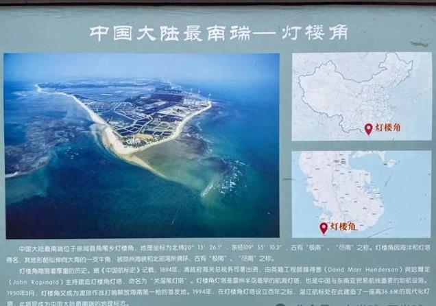 中国大陆最南端位于广东省湛江市徐闻县角尾乡灯楼角,它被琼州海峡和北部湾所环拥,地形似伸向大海的牛角,并与海南岛隔海相望,也被称作中国大陆南极村(图一至图三)。灯楼角尖形的沙洲是琼州海峡和北部湾潮流的合水线,两个海区的海水在此相互拍打(图四、图五)。灯楼角曾于1894年建造了雷州半岛最早的航海灯塔(图六),百年后的1994年又在此处新建了一座现代化的灯塔(图七),成为中国大陆最南端的地理标志。灯楼角还是1950年中国人民解放军解放海南岛渡海作战的启渡点,至今还能看到当时的作战指挥所和无名烈士墓(图八、图九)。