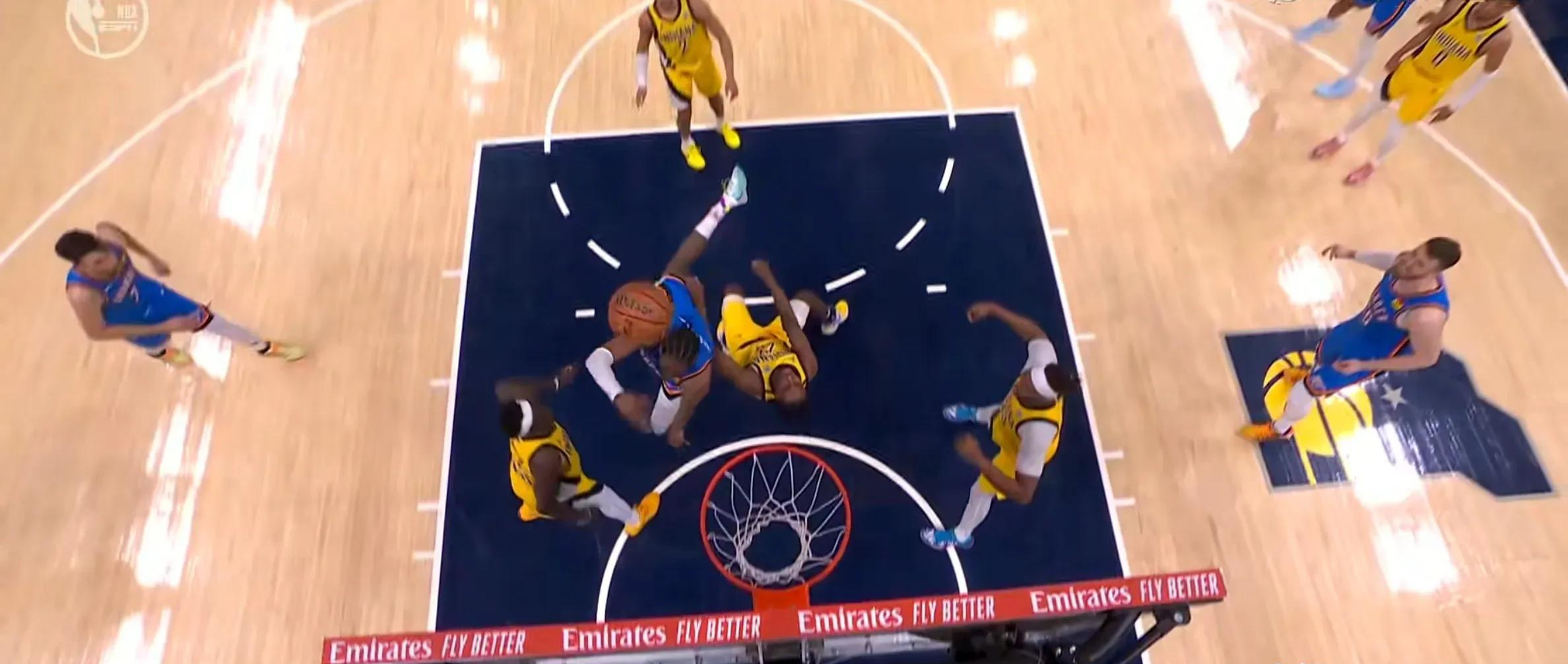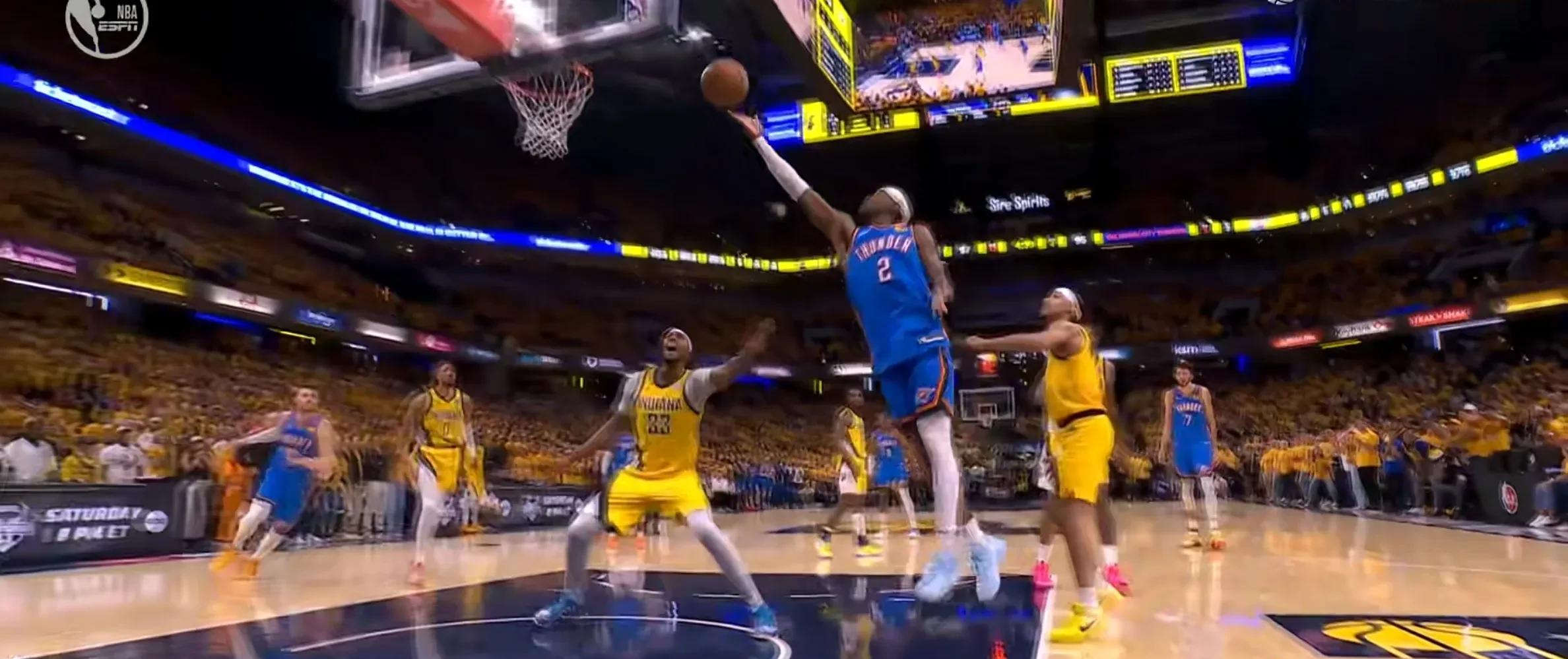 第2节比赛开始,亚历山大连拿4分,双方战成40平。谢坡德3分命中,亚历山大也再次亮出绝技中投稳稳打进,麦卡奈尔过掉亚历山大,上篮命中,霍姆格伦送上大火锅,威廉姆斯上篮打中46比45。卡鲁索抢断反击被凶狠犯规两罚一掷,内史密斯底角强投3分命中,哈利不看人传球助攻西卡上篮得手53比50。托平天降飞仙式补扣得手,哈利骑着扫把式的极限拉杆命中,半场结束,雷霆57比60步行者。