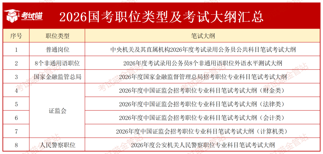 2026国考笔试试卷共有8个笔试考试大纲,除了公共科目外,还有一些职位需要考专业科目,考察重点各不相同,所以不同岗位的考生需要掌握的重点也不同,一起来看看吧。