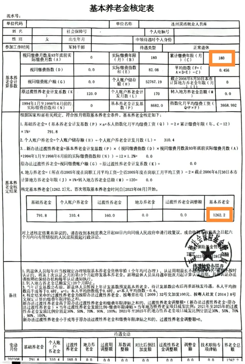 附基本养老金核定表: