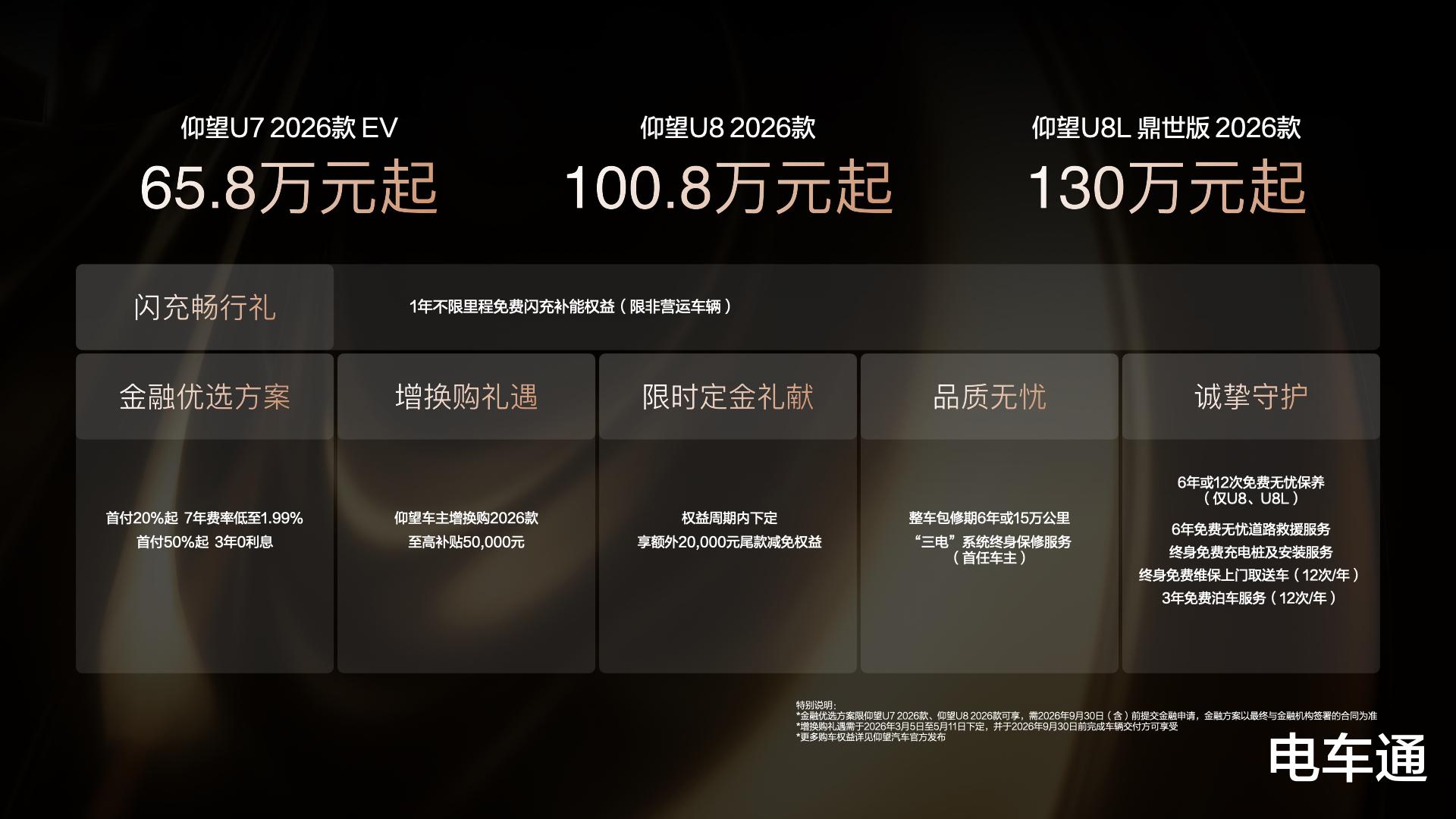 在这次发布会中,仰望U7、仰望U8、仰望U8L的2026款同步上市,其起售价分别为65.8万元、100.8万元和130万元。