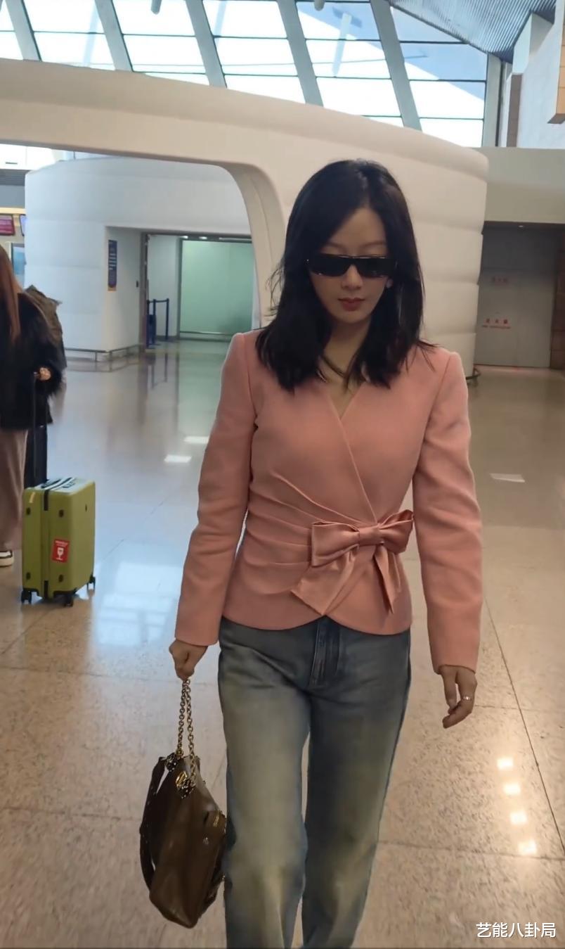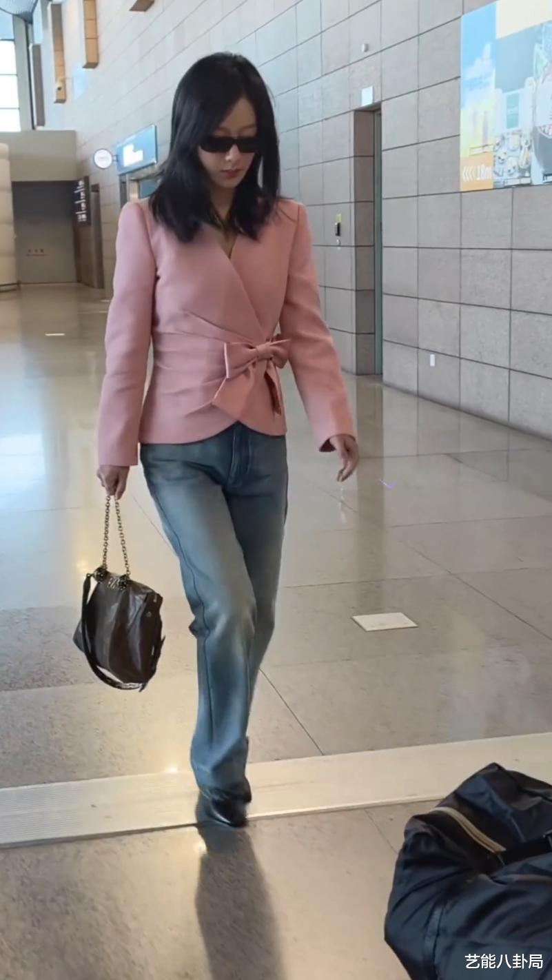 粉色蝴蝶结掐腰外套+浅蓝色牛仔裤+黑色包包皮鞋,充满了复古的年代感。