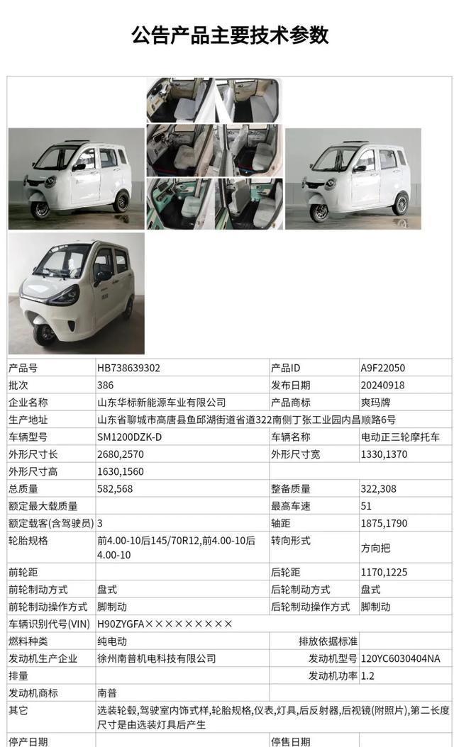 就拿那个产品商标叫做爽玛,车辆型号是SM1200DZK-D的电动三轮摩托车来说吧。