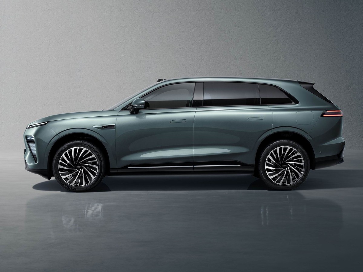 车身侧面,星纪元ET的设计同样饱满而富有张力。笔直的腰线从车头贯穿至车尾,带来强烈的气势和运动气息。作为新能源车型,新车的侧面相当简洁,搭配隐藏式门把手和多辐旋风造型的轮毂,颇具豪华感。