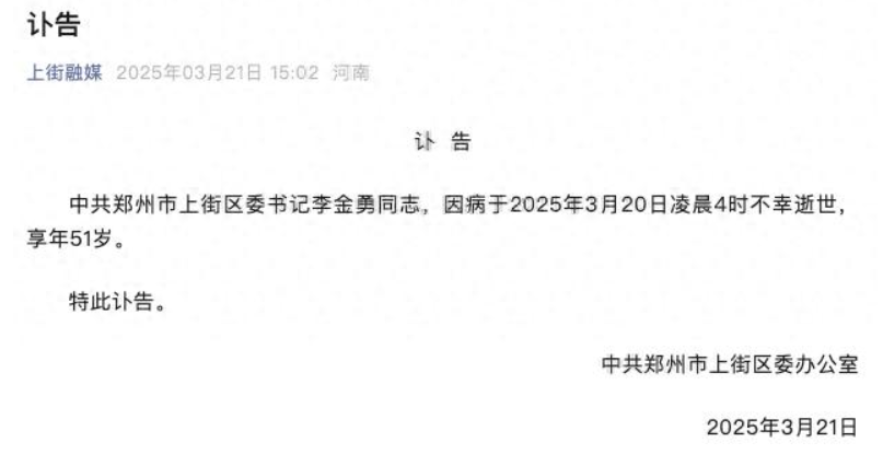 据当地新闻中心披露,李金勇同志生前主持召开了最后一次区委常委会是在逝世前五日。医疗记录显示,其长期患有慢性心血管疾病,近期因工作强度过大导致病情恶化。目前治丧委员会已成立,将按照党员干部相关规定办理后事。