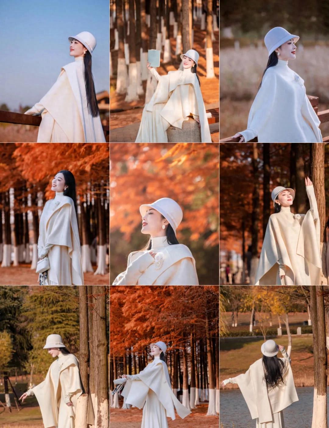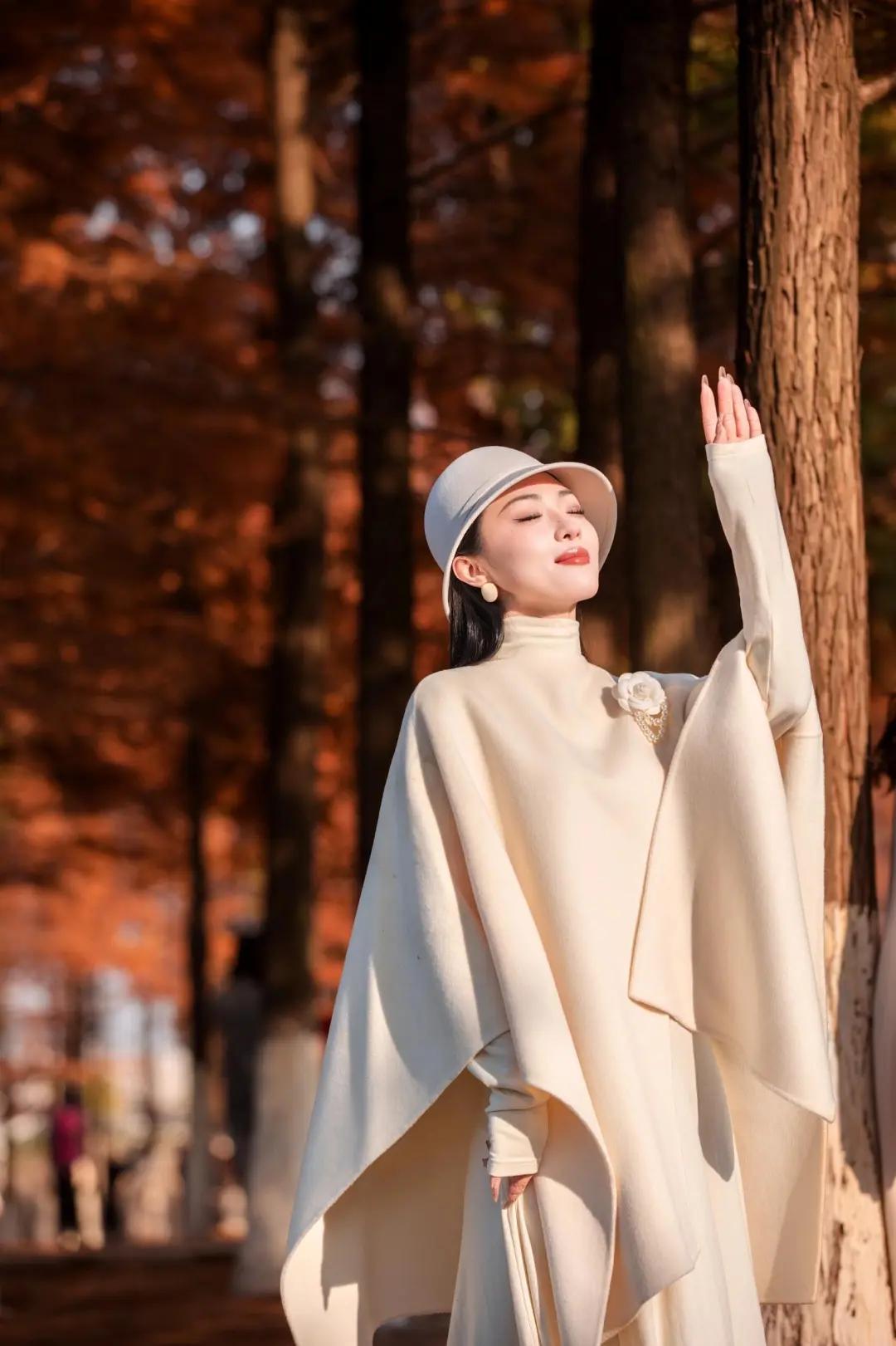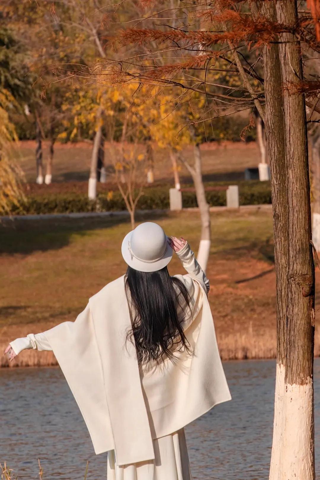 站在秋冬的树林轻轻转一下身体,让包自然垂着或者轻轻提在手里,摄影的人抓一下你转身那一刻的笑,中年女士拍照用这个动作会显得很灵动,轻轻一转的瞬间衣摆会动,头发也会动,笑容自然又不生硬,照片就会有自然的轻盈感。