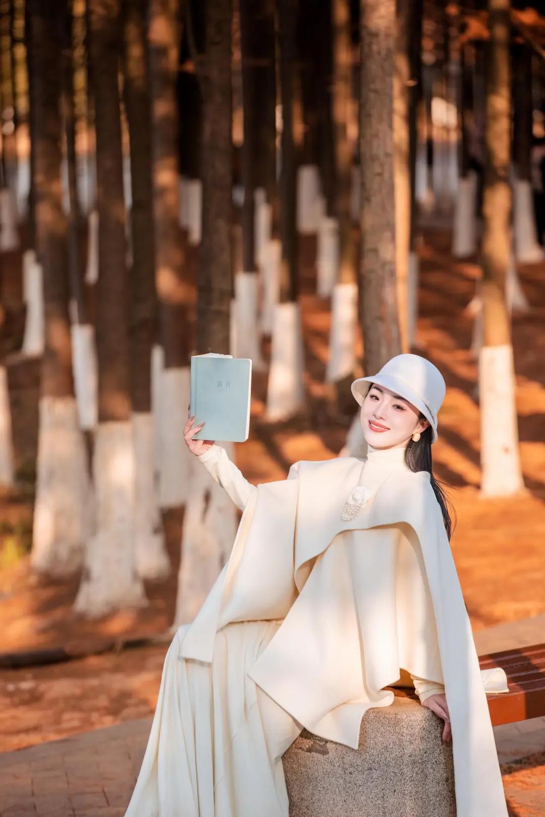 可以再公园、树林找地方侧身坐下来,把书拿在手上轻轻举着,身体微微侧过,把头回过来看镜头笑一下,这个动作特别适合中年女士拍照,因为坐着会显得很放松,拿书会带点文雅气质,回头笑的瞬间也不会太刻意,画面会很柔跟美。