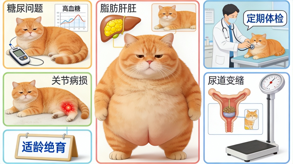 (一)高风险健康隐患1. 肥胖相关疾病:体重超过理想体重 30% 即为肥胖,易引发糖尿病(症状为多饮多尿、体重骤降)、脂肪肝(表现为食欲减退、黄疸)、关节劳损(步态异常、不愿活动)等疾病,其中脂肪肝是肥胖橘猫的头号杀手。