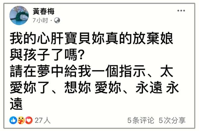 此前6月25日凌晨,S妈也曾连发6篇帖文,悲诉对爱女的思念,称“我的心肝宝贝你真的放弃娘与孩子了吗?请在梦中给我一个指示、太爱你了、想你爱你、永远永远”,并将该则贴文转发5次。这一举动也让众多网友为之动容,纷纷留言安慰。