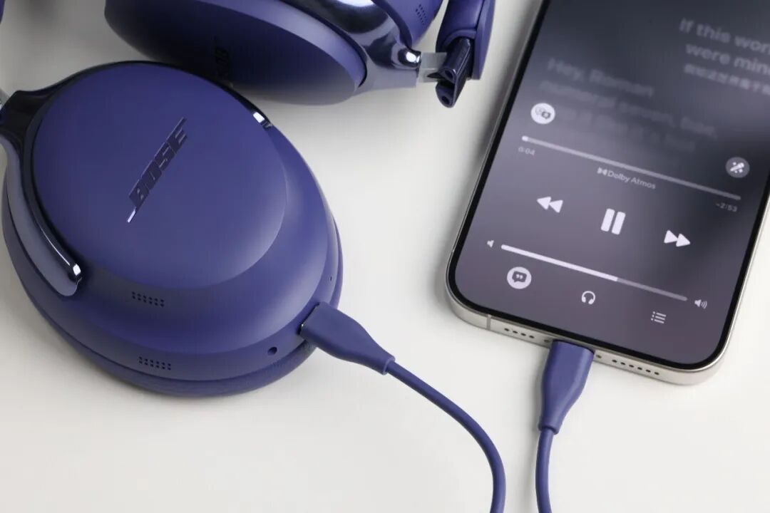 在Bose QC消噪耳机Ultra上仅用来充电的USB-C接口,在Bose QC消噪耳机Ultra II上多出了一个重要的功能——能通过USB线连接手机、PC等设备,实现USB-C有线数字无损音频传输功能。这使得Bose QC消噪耳机Ultra II在原有的蓝牙无线连接和音频线连接的基础上,解锁了新的使用场景,例如通过低延迟音频特性满足桌面或移动端游戏需求,同时在针对播放无损格式、对音质要求更高的聆听场景下,耳机通过USB-C连接接受更高品质的音频信号,更好地保留音乐中的细节,带来更高品质的听觉体验。