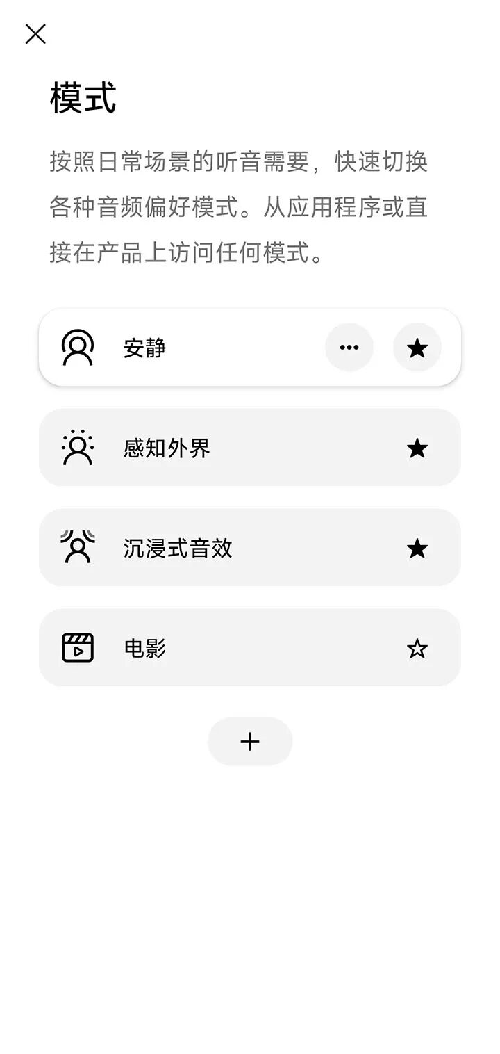 在“模式”菜单中,可以看到默认的安静、感知外界、沉浸式音效和电影四种模式,通过长按右耳罩侧面的多功能按键便可在这四种模式间切换,用户可以通过语音提示判断切换到了哪个模式。安静模式的消噪等级最高,沉浸式音频关闭,并且都不可调。感知外界模式的消噪和沉浸式音频关闭且不可调,用户可选择是否打开ActiveSense噪声动态感应,以提升该模式下的使用体验。沉浸式音效模式消噪等级最高,沉浸式音频固定在动态,不可调。电影模式消噪等级最高,沉浸式音频固定在静态,不可调。