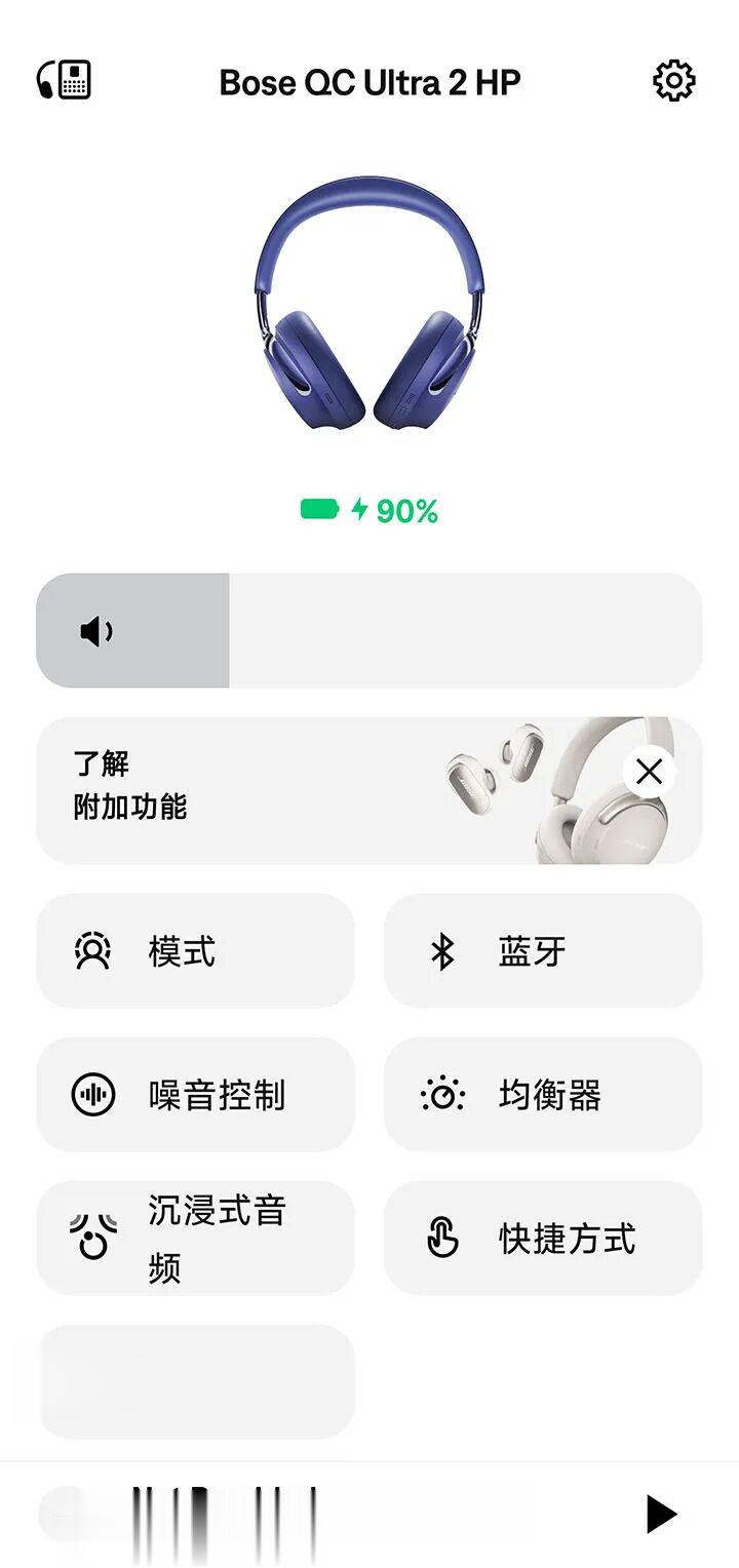 我们通过Bose App来说明Bose QC消噪耳机Ultra II具备的功能。App首页清晰显示耳机当前电量与音量,并集中了模式、蓝牙、噪音控制、均衡器、沉浸式音频、快捷方式及产品提示等核心设置入口,点击任一选项即可进入二级菜单进行细化调整。若点击首页右上角的“设置”图标,除了上述功能外,这里还支持自定义设备名称、更新固件、开关佩戴检测与语音提示等更多选项,方便用户根据个人使用习惯设置耳机。