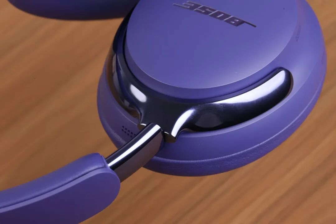 Bose QC消噪耳机Ultra II设计上让人印象深刻的地方在于其整体性,不论是耳机外壳,还是可伸缩的头梁支架,耳机上的很多地方都能带来这种观感。紫色的雾面壳体上,看不到半条拼接缝隙,从正面的椭圆形平面,到侧面的弧面,每一处面与面的过渡都很细腻,没有生硬的棱角,手指从耳壳体滑过,能感觉到自然顺滑的过渡处理。