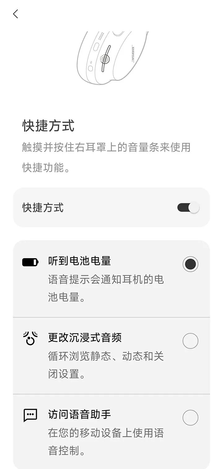 在“快捷方式”菜单中,用户可以选择开启它,并在听到电池电量、更改沉浸式音频以及访问语音助手三种功能中选定自己最常用到的一种,这样长按音量条就能激活该快捷操作。