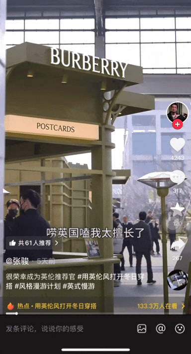 比如在Burberry此次合作中,时尚创作者@WERNER 对Burberry最新广告片中的英伦文化梗和彩蛋进行了深度解读,从文化视角带领用户更深入地了解品牌内核;抖音创作者@张骏 作为线下活动的「英伦推荐官」一边讲段子一边带用户打卡“英式慢游”活动现场,用英式冷幽默传递品牌心智,强化互动趣味性;更多的抖音时尚创作者则亲身演绎风衣、大衣、格纹等Burberry经典英伦风符号,分享自己的穿搭灵感,带动更多用户把英伦穿搭风格融入生活的各个场景,实现品牌心智渗透和种草。