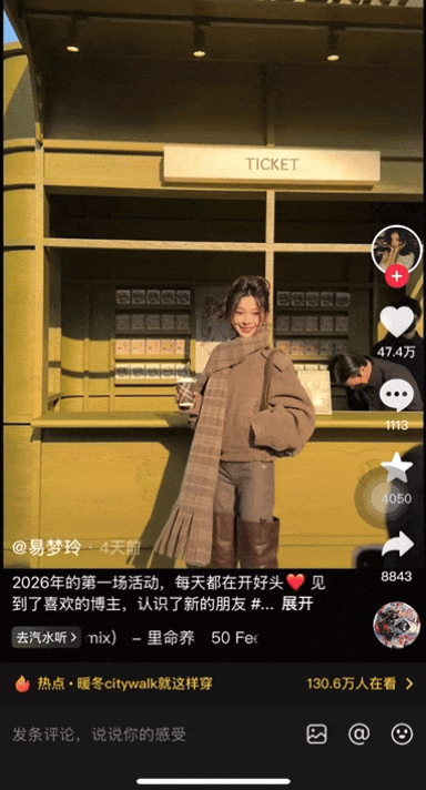仔细看品牌抖音官方账号发布的广告片会发现都带有一个话题#英式慢游 ,这也是Burberry自2024年起创建的一个品牌长线IP,通过将标志性的英伦生活场景复刻到城市中,将品牌的英伦文化内核带进消费者的日常生活场景中,强化消费者对Burberry英伦风格的认知,同时增强情感链接。