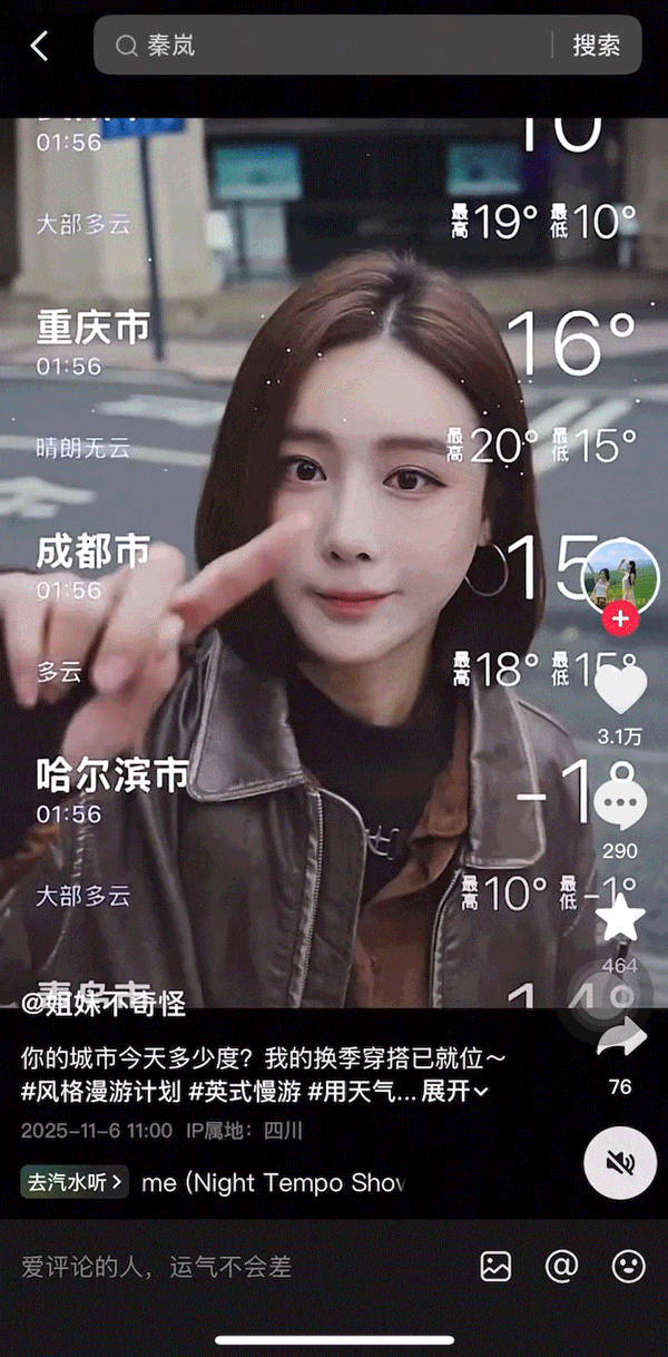 点开话题页几个高赞视频,@曹甚麽 以风衣、格纹围巾搭配日落氛围营造出的假日漫游风,@ChiliCharlotte 用格纹裙、骑士靴打造出校园之外依然可以尝试的英伦学院风 ,@姐妹不奇怪 用格纹长裙搭皮衣给出了成都换季降温的穿搭解法……可以看到,大衣、风衣、骑士靴、格纹等具有标识性的英伦风格穿搭元素高频出现。